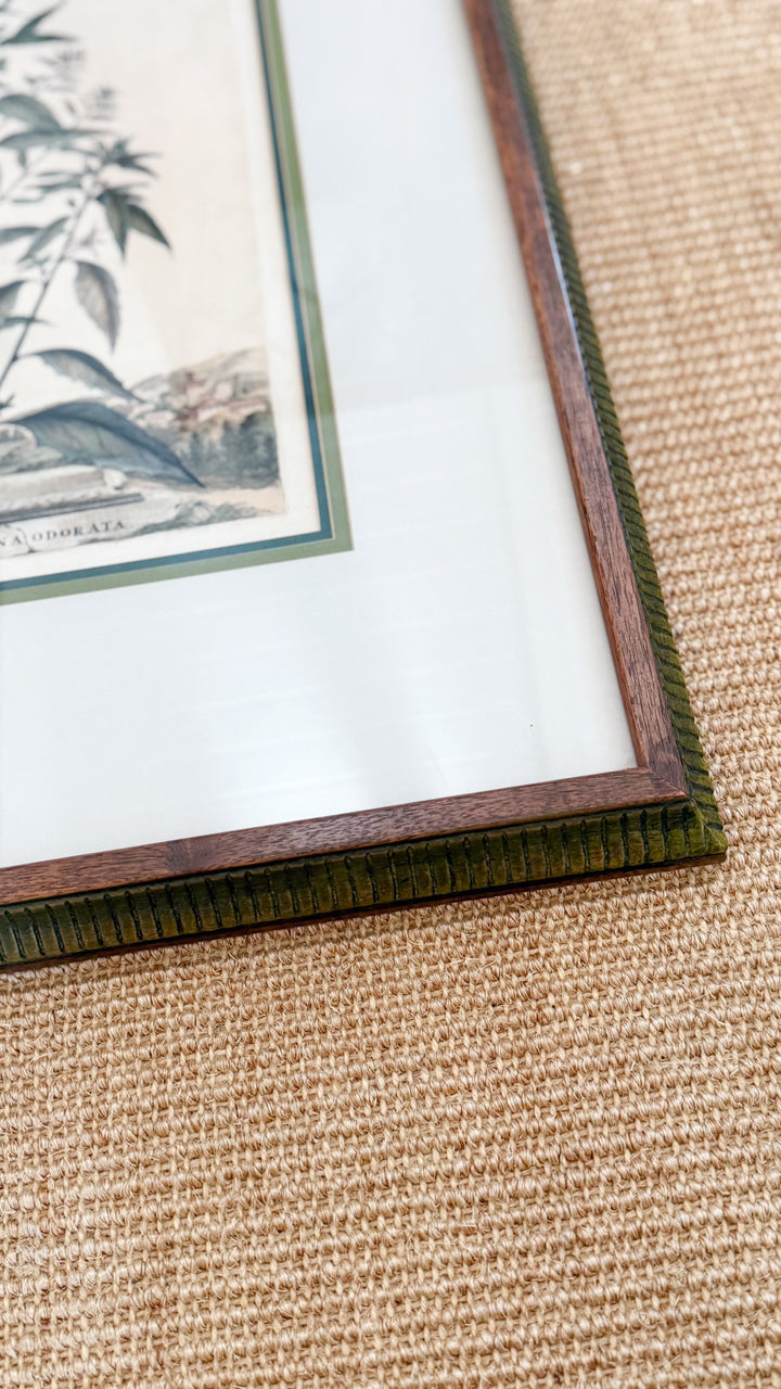 Exquisite 17th century European botanical lithographs by renowned Dutch botanist and artist Abraham Munting. Each original antique lithograph is beautifully hand-colored. The botanicals are presented in matched custom wood frames. The custom frames are finished with soft green edges to subtly complement the natural tones of the artwork. Whether displayed individually or together as a pair, these authentic heirloom botanicals will bring a sense of sophistication and beauty to your home.