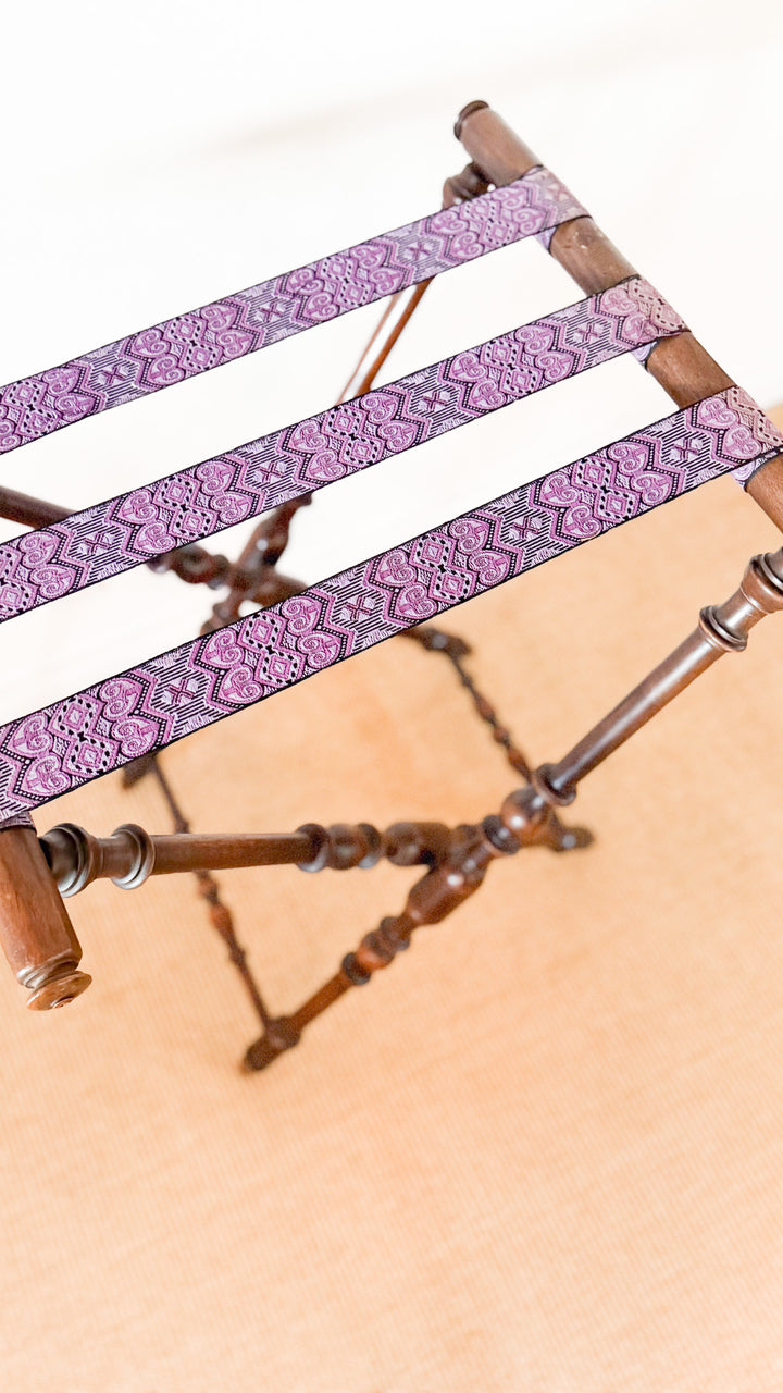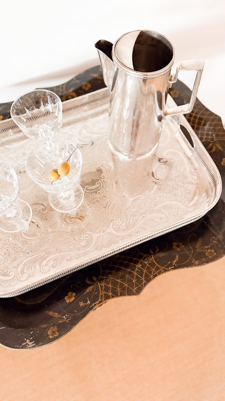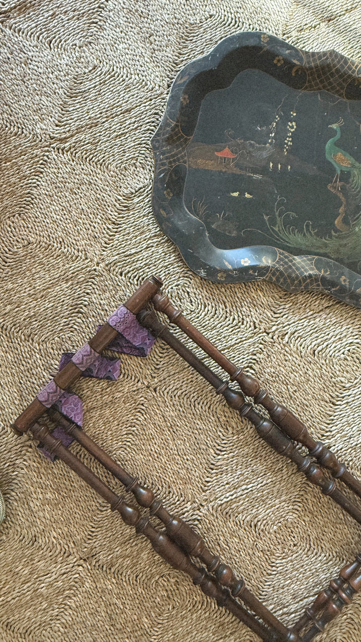 This exquisite 19th-century French tray stand, believed to date back to the 1830's, features elegantly carved wood legs and a foldable design for easy storage. We've paired it with a charming early vintage tole tray, hand-painted and carefully chosen to complement the stand. Together they make a stunning and functional accent piece.