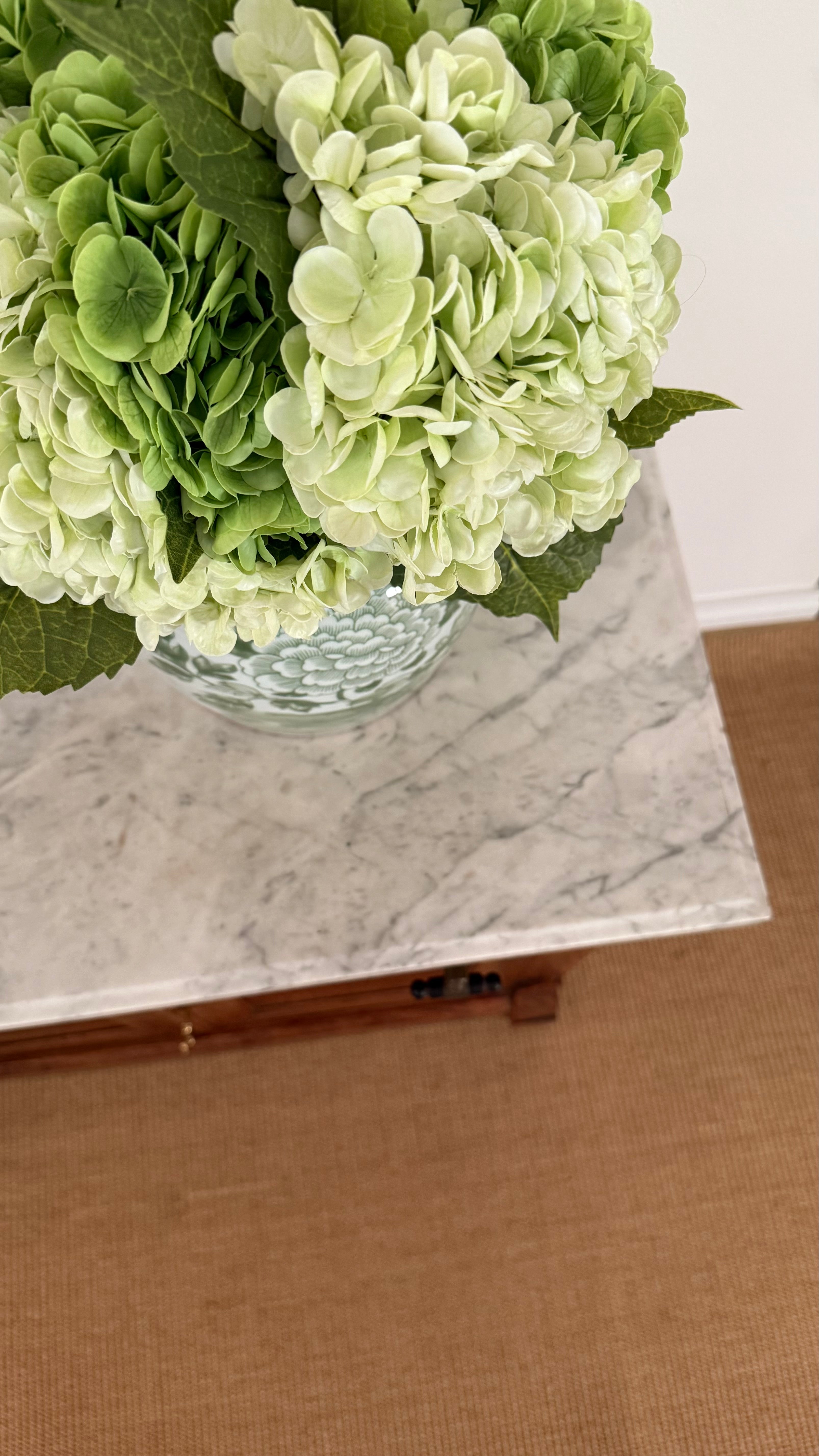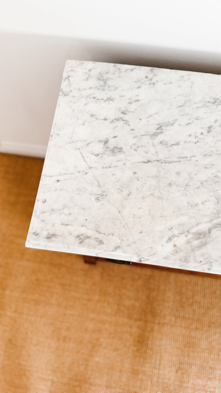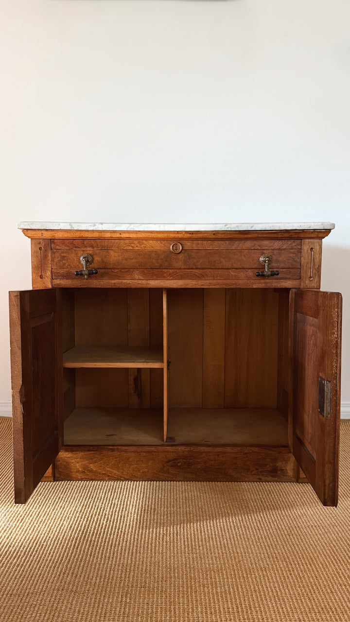 Antique 19th century marble top cabinet. The ideal size for a nightstand or small entry table. Features beautiful architectural details, burl wood accents and brass and black drawer pulls. Single drawer above and cabinet below with separate compartments. Includes new custom fitted key.