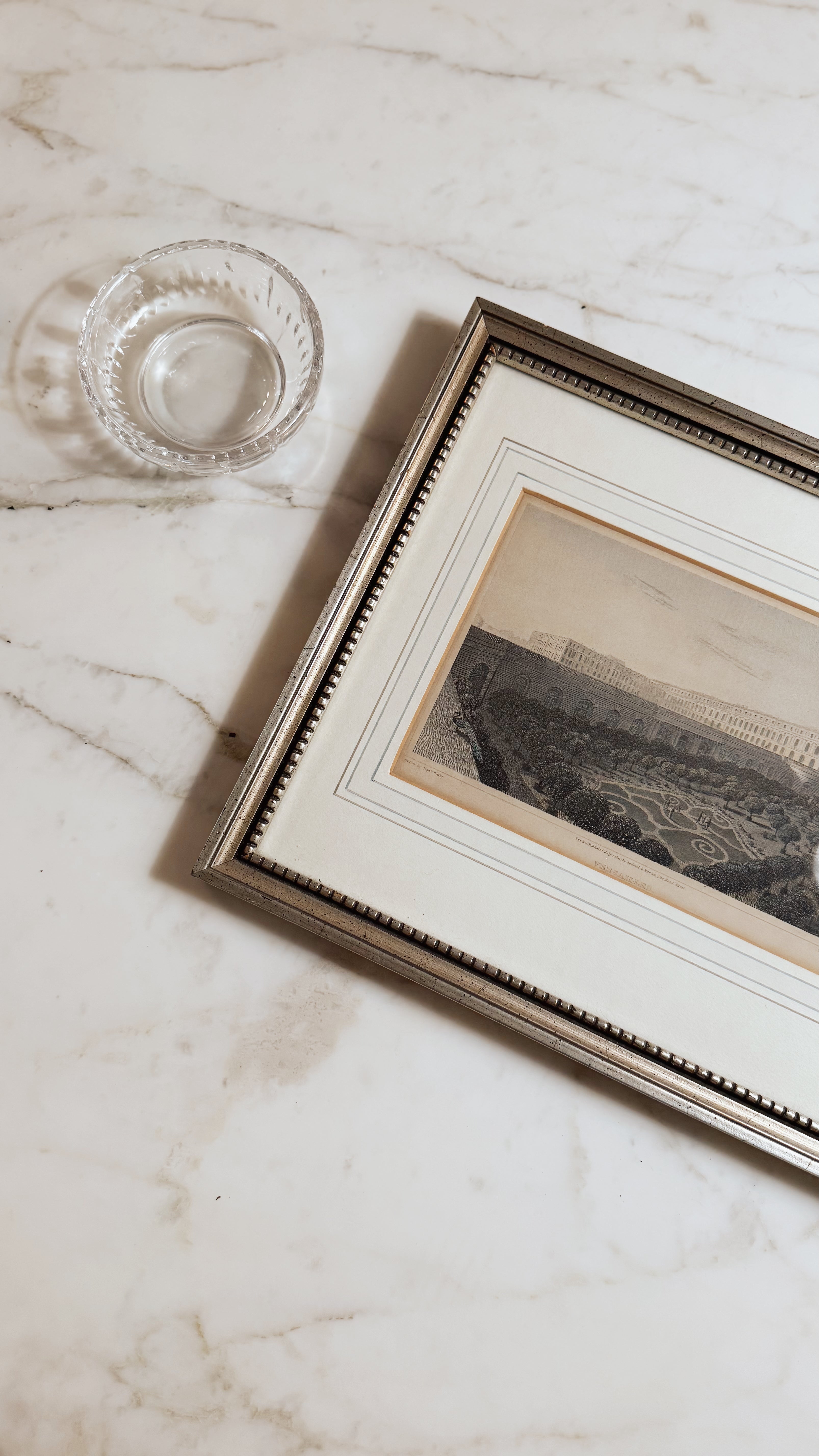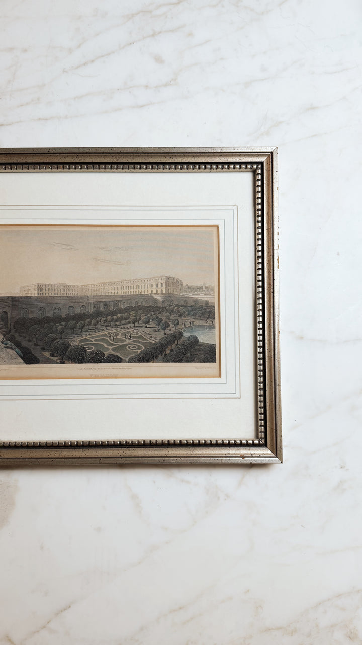 Elegant antique English engraving featuring Versailles in soft muted tones. Features a beautiful custom frame.