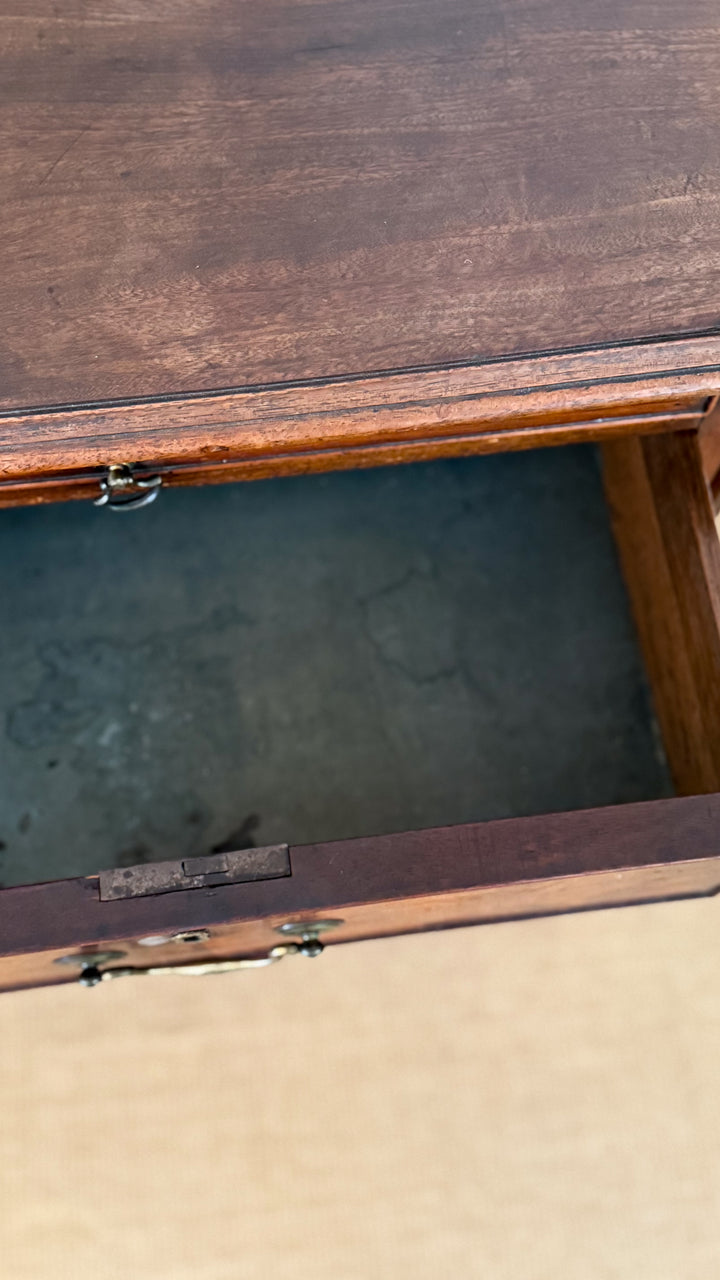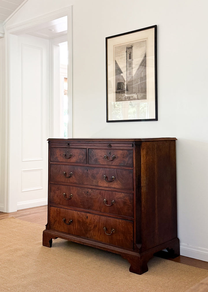 A distinguished example of Georgian style furniture. This mid-19th century English dresser features five generously scaled drawers accented with original brass pulls. The richly figured flame mahogany showcases striking depth and movement, bringing warmth and refinement to any room. A hidden writing slide adds both charm and functionality. Elegant, timeless, and impeccably crafted, this dresser is a beautiful statement piece for collected interiors.