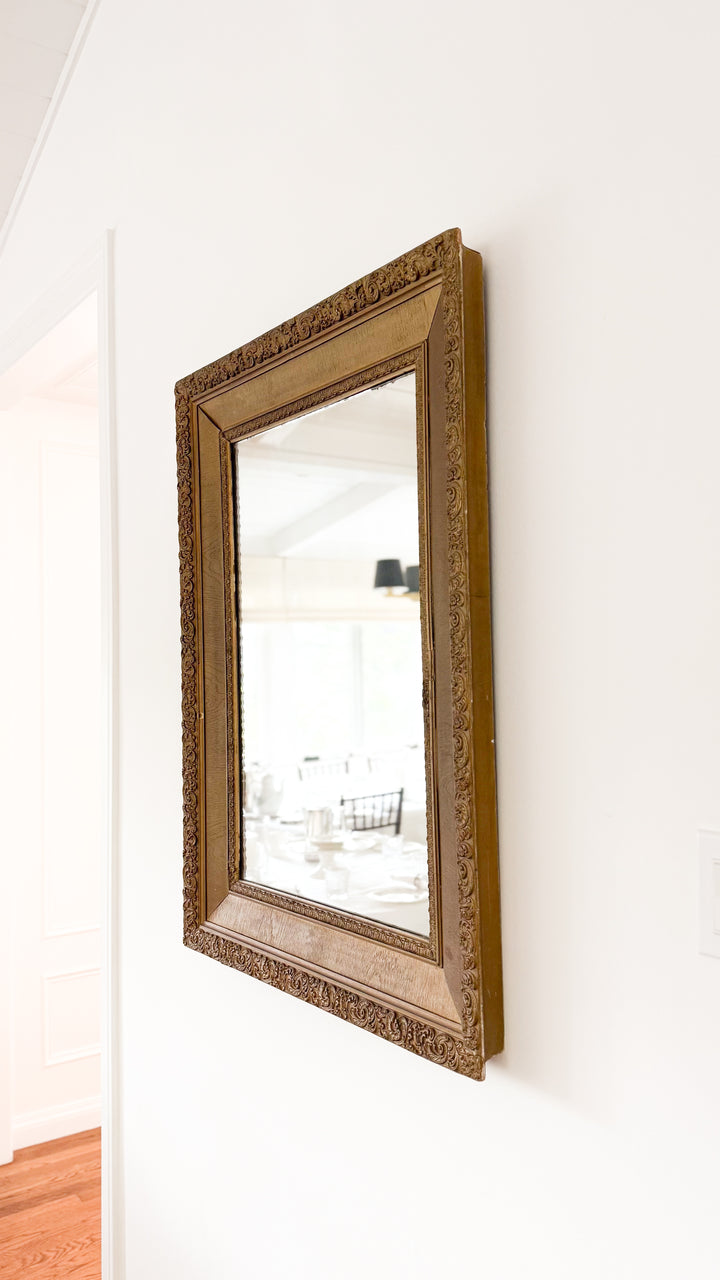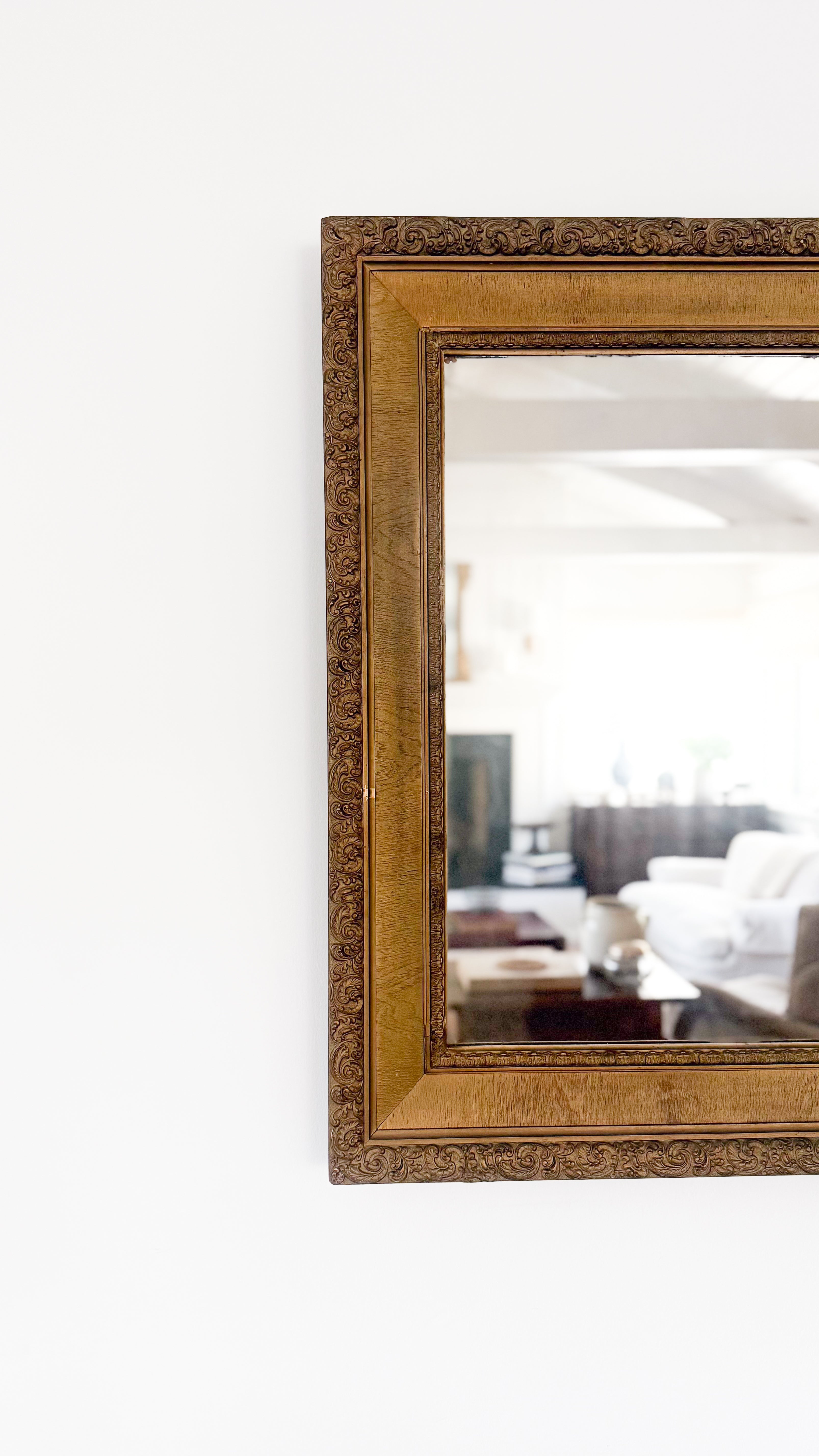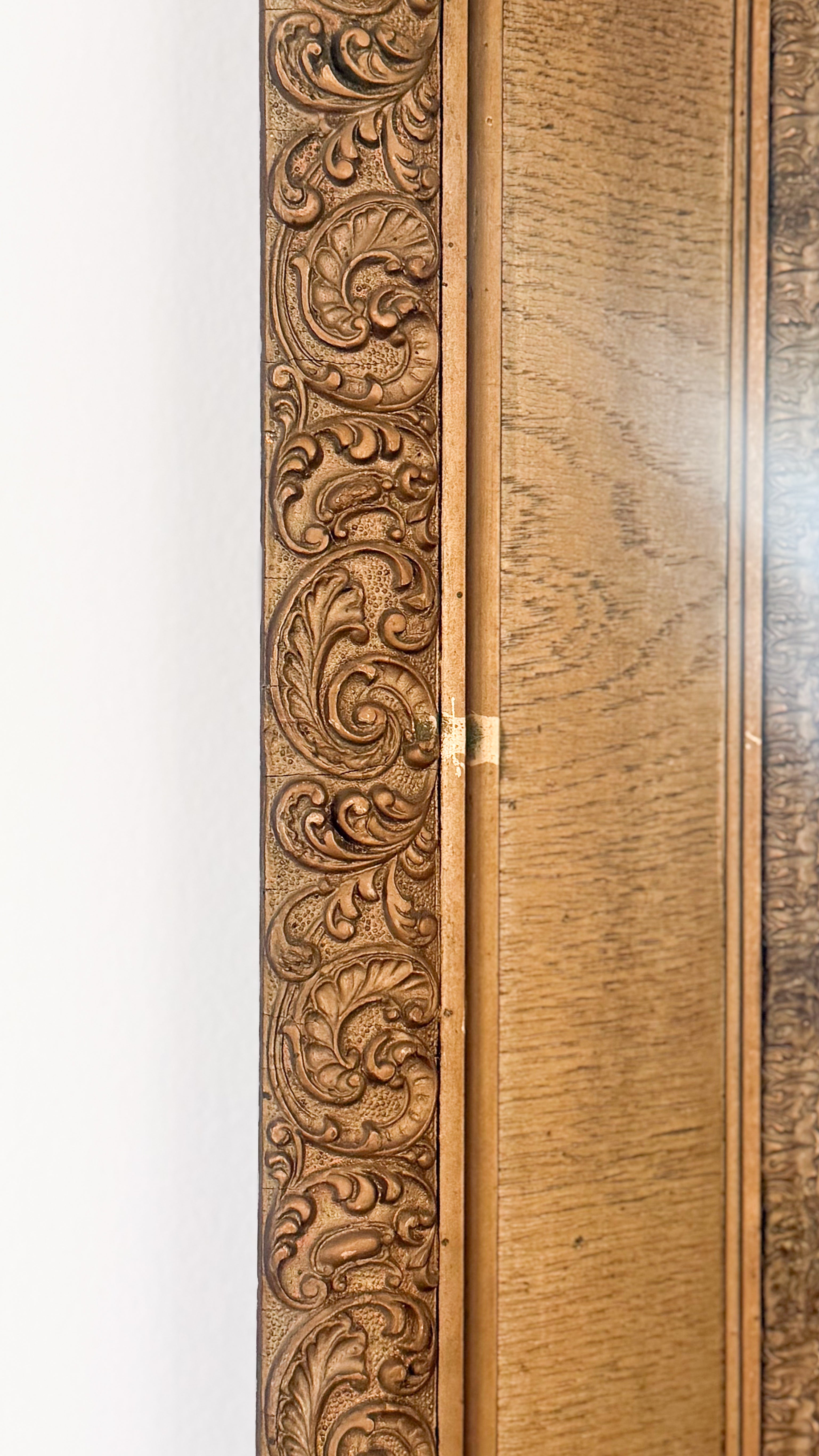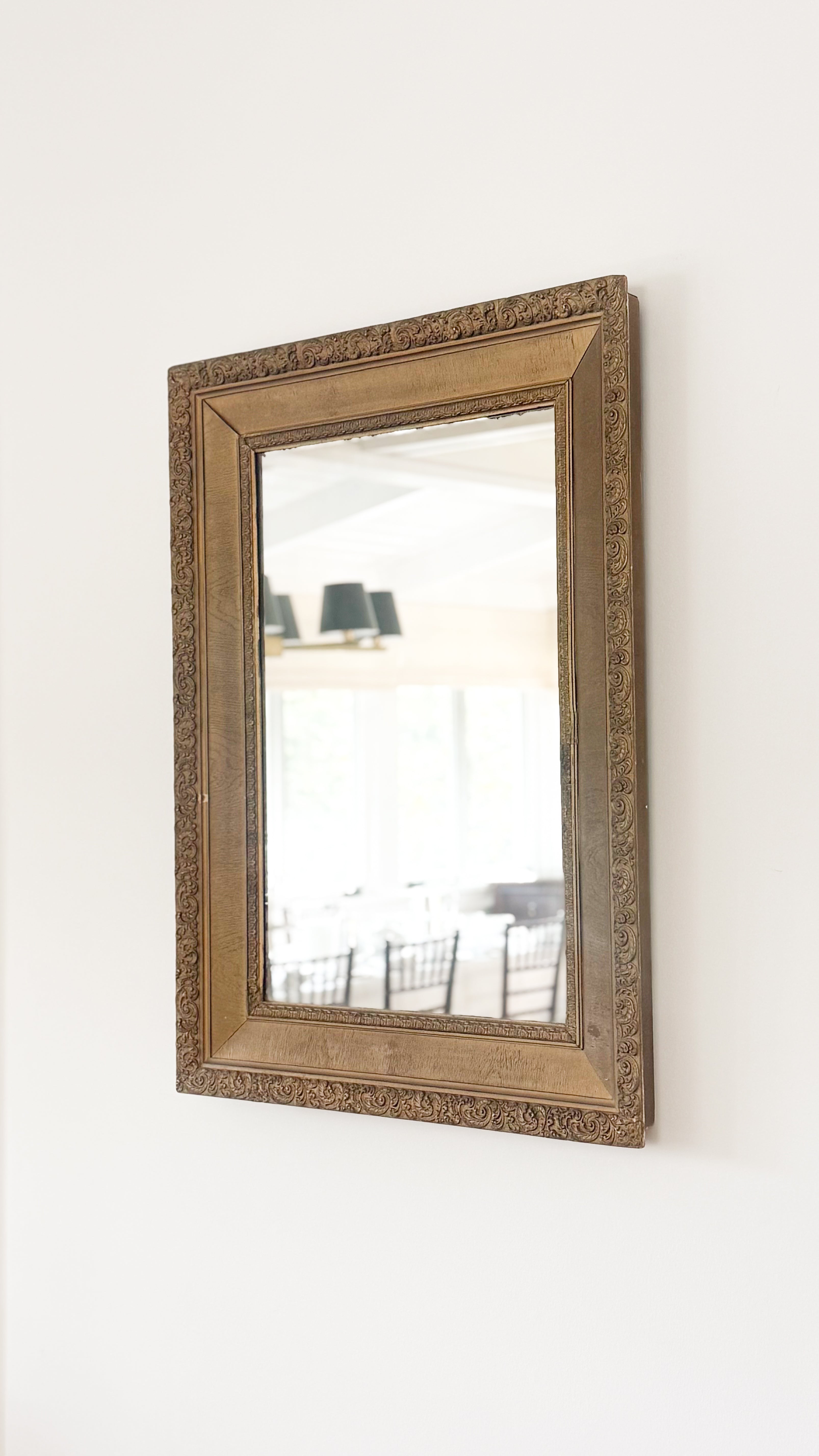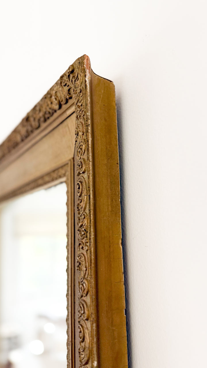 A beautifully detailed antique gilt gesso mirror with its original glass. Rich patina and time-worn texture highlight the craftsmanship, while the generous scale makes it ideal for anchoring a mantel, console, or use above a sink in a bathroom. A timeless piece that adds warmth and character to any space.