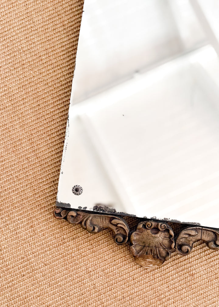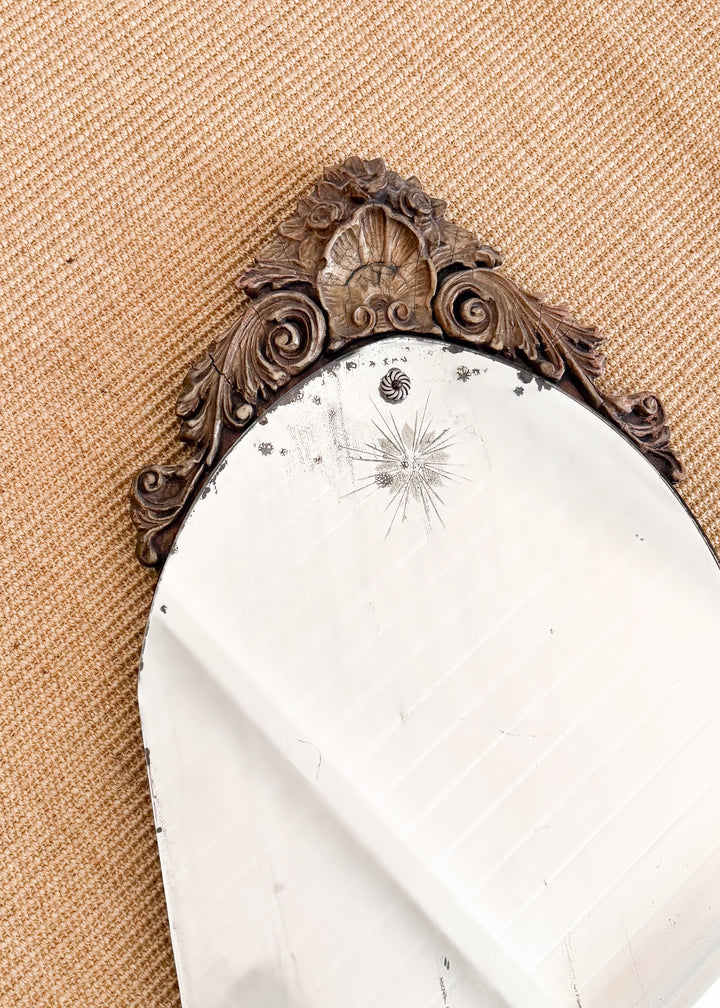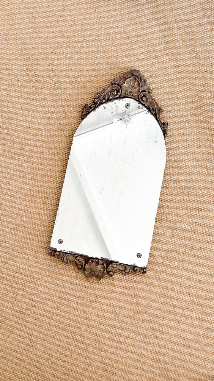 An antique/early vintage gilt wood mirror from the early 20th century. Mirror shows beautiful signs of age. Wonderful petite size perfect for a guest powder room or ladies vanity.