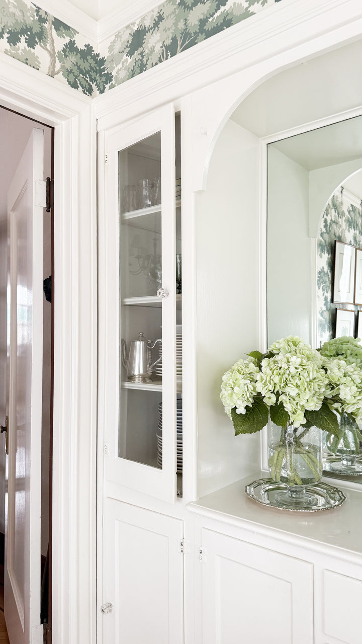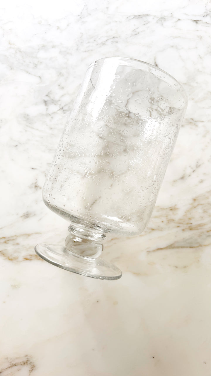 Handcrafted glass vase featuring bubble glass and a pedestal base. Pair with our vintage silver trays and luxe faux flowers for an elevated look.