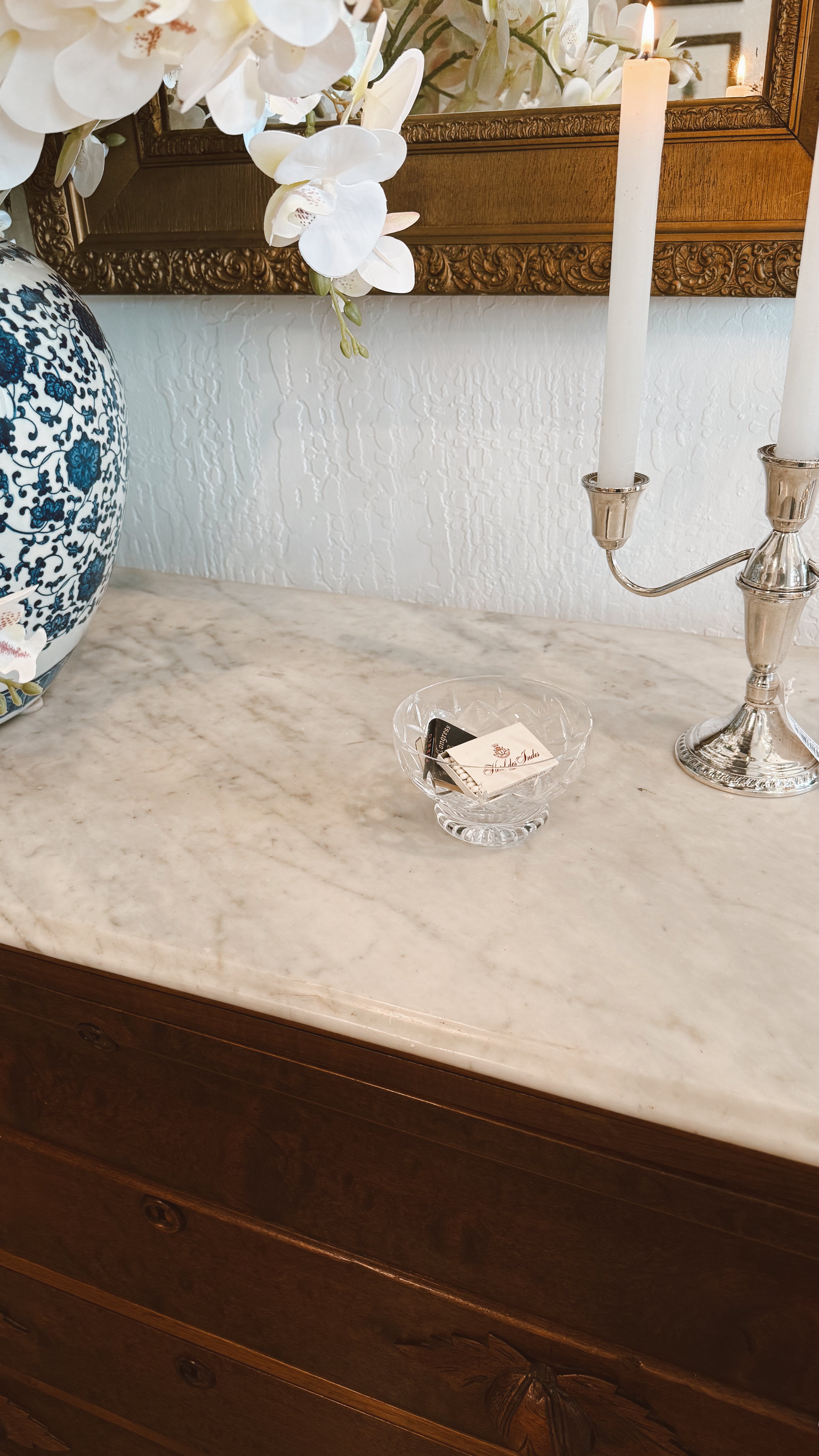 Vintage crystal bowls or trinket dishes to elevate the every day. We love to use the small sizes to hold matchbooks on a coffee table or as a decorative accent in a vignette. They also make great additions to a charcuterie spread for olives, nuts or any of your favorite appetizers. Larger crystal bowls are well suited for decorative accents and catch-alls. They are also beautiful vessels for low floral arrangements.