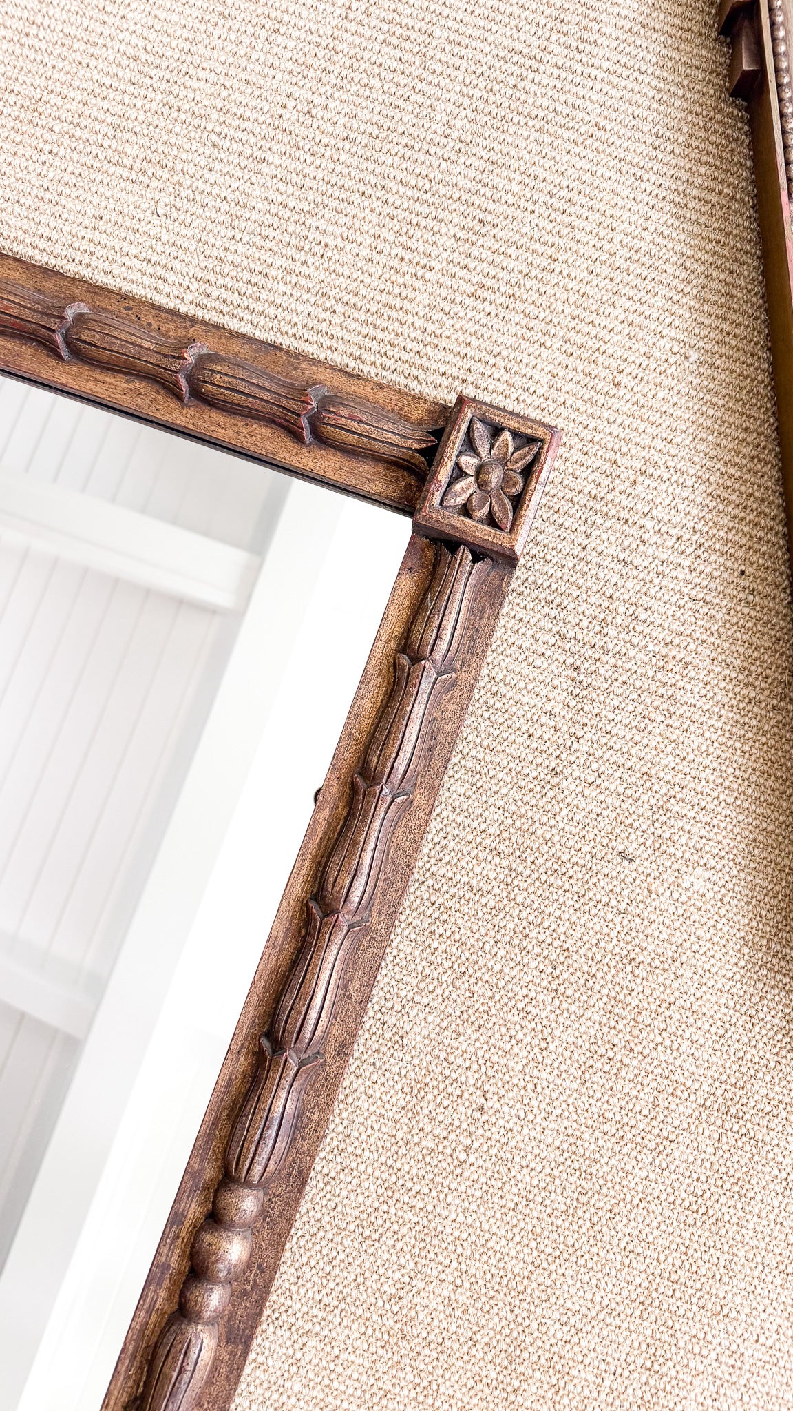 An early vintage gilded frame, beautifully repurposed as a mirror. Crafted from carved wood and rich in patina, it exudes timeworn elegance and classical detail. With its warm gold finish and timeless silhouette, this piece brings enduring charm and quiet grandeur to any space.