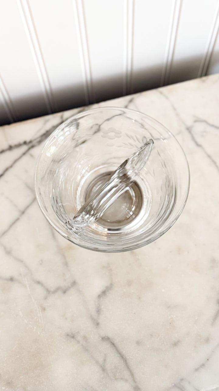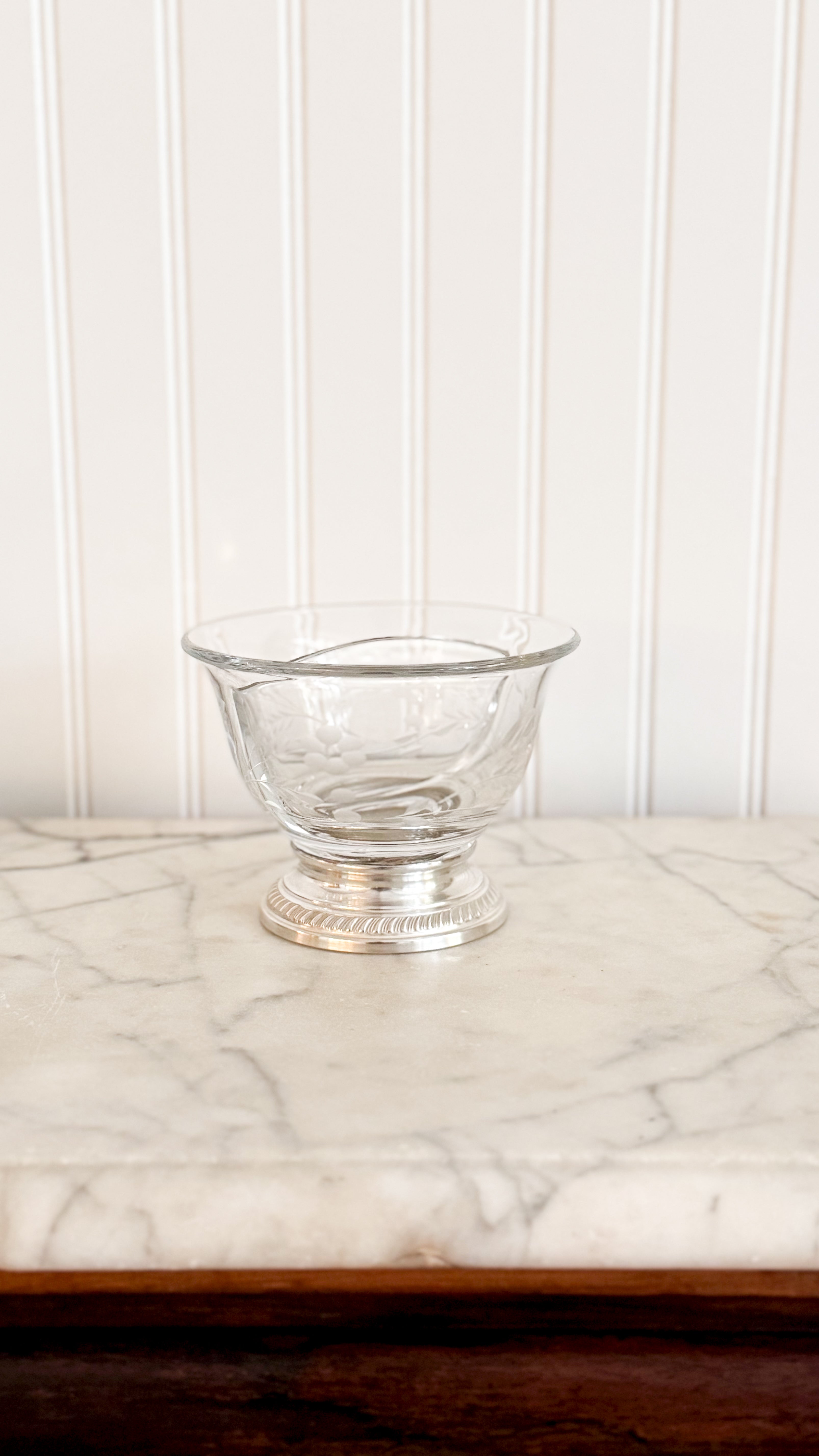 This elegant divided bowl pairs a sterling silver base with a fine glass bowl by Heisey. Founded in 1895, Heisey is celebrated for its clarity and craftsmanship in glassware. The dual compartments of this bowl make it as versatile as it is beautiful. It is perfect for serving condiments, small appetizers, or displaying trinkets. For the holidays, we would fill the bowl with peppermint candies. A timeless accent for the home.