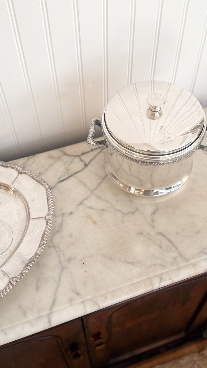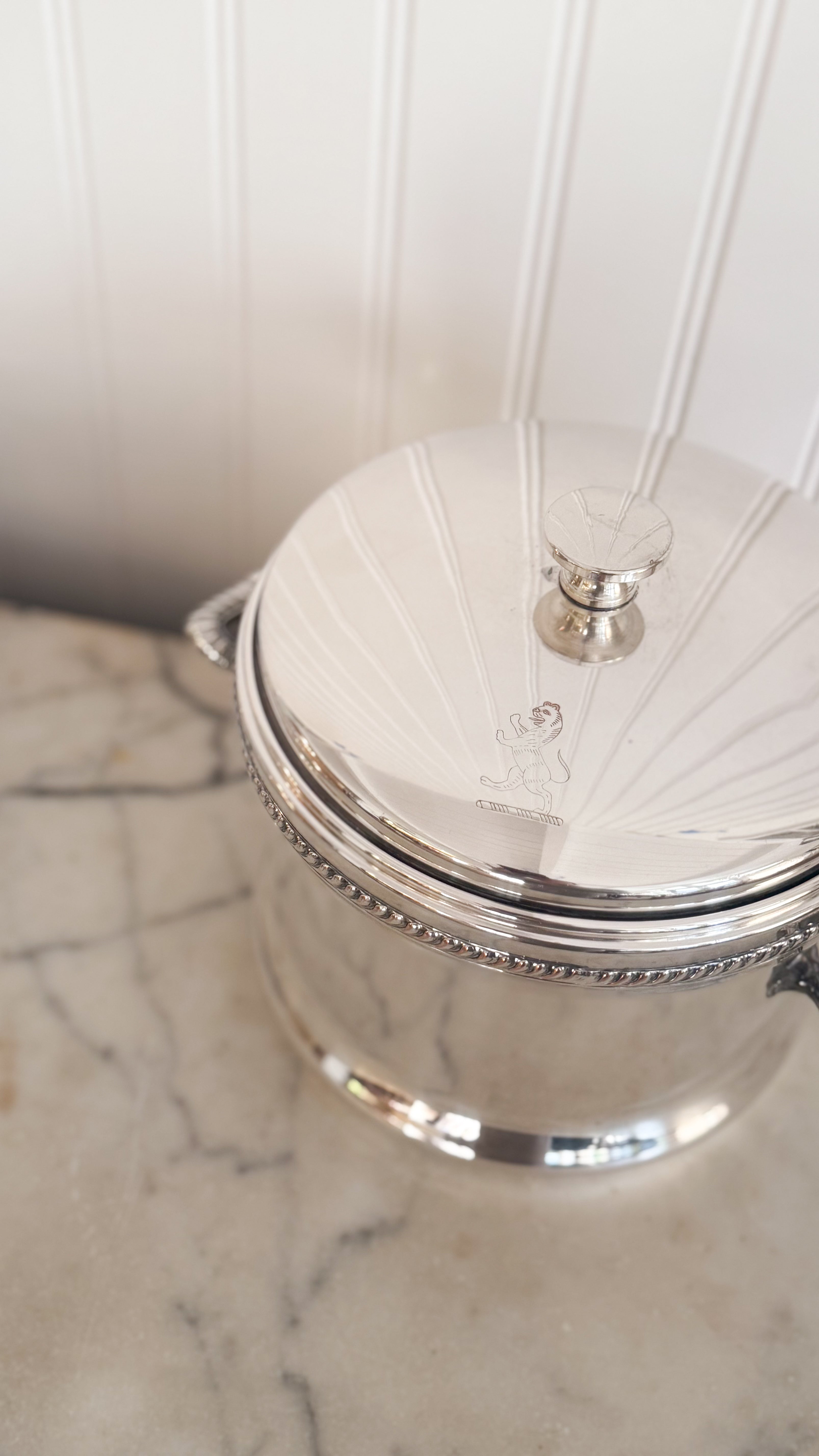 A refined vintage silver plate ice bucket featuring a distinguished lion etching on the lid. Beautifully crafted with substantial weight and an insulated interior, this piece combines timeless elegance with practical function. Perfect for entertaining and styling.
