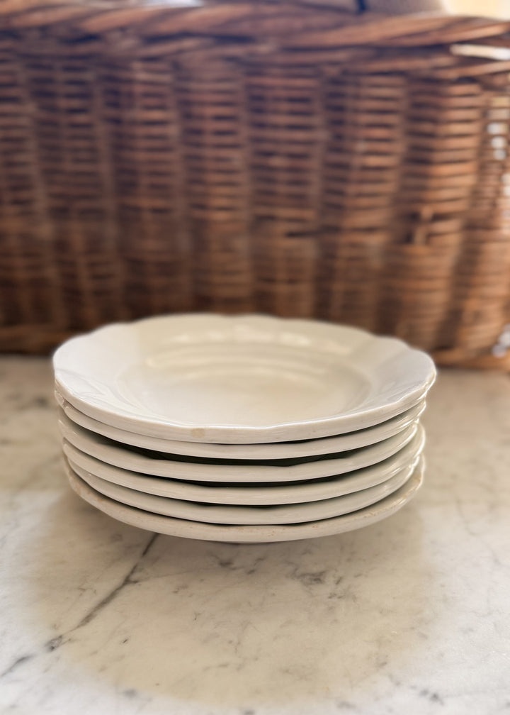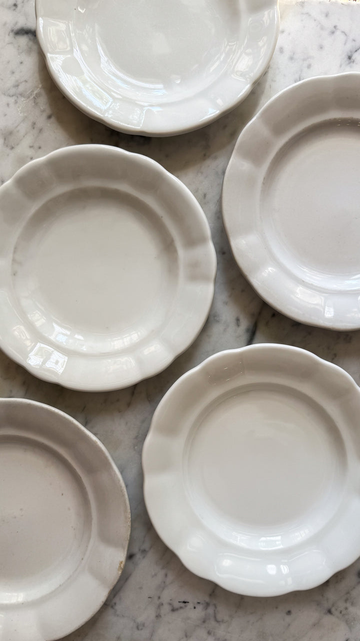 A set of six closely matched early vintage & antique porcelain plates with different European makers. An ideal size for appetizers, salad or dessert courses. Substantial white porcelain with attractive, softly scalloped rims. A forever classic.