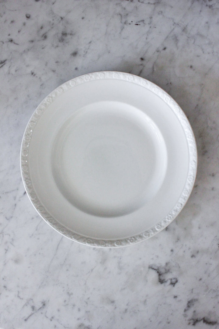 A classic set of 6 vintage English ironstone dinner plates, featuring a clean white base accented by a delicate floral border. Perfect for everyday dining or layered, collected tablescapes.
