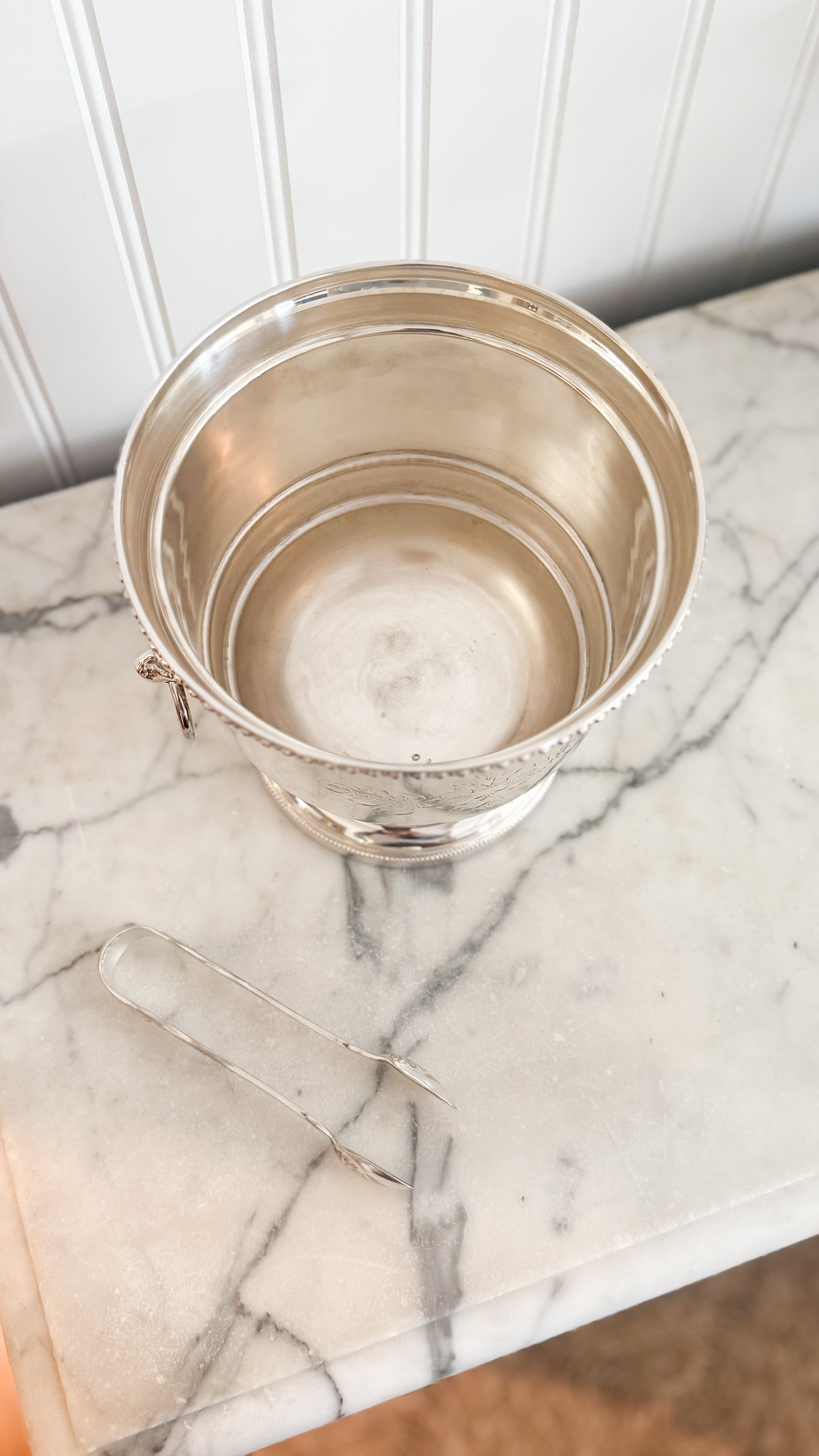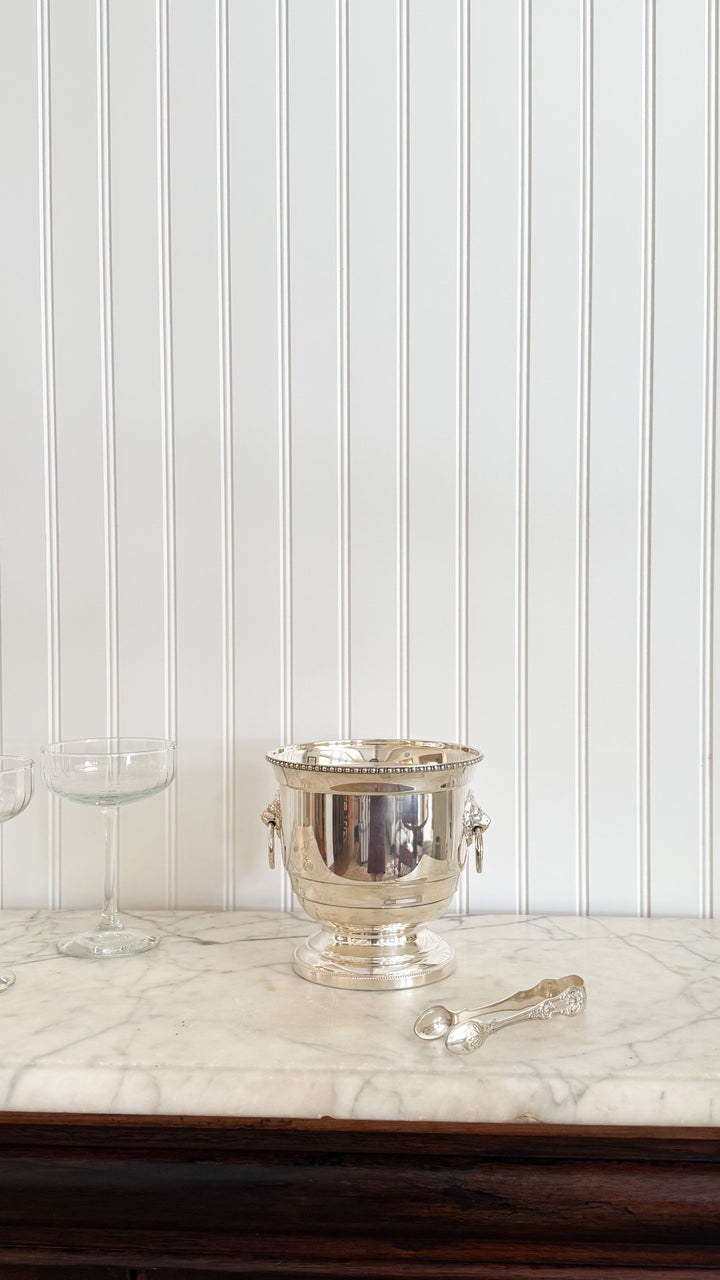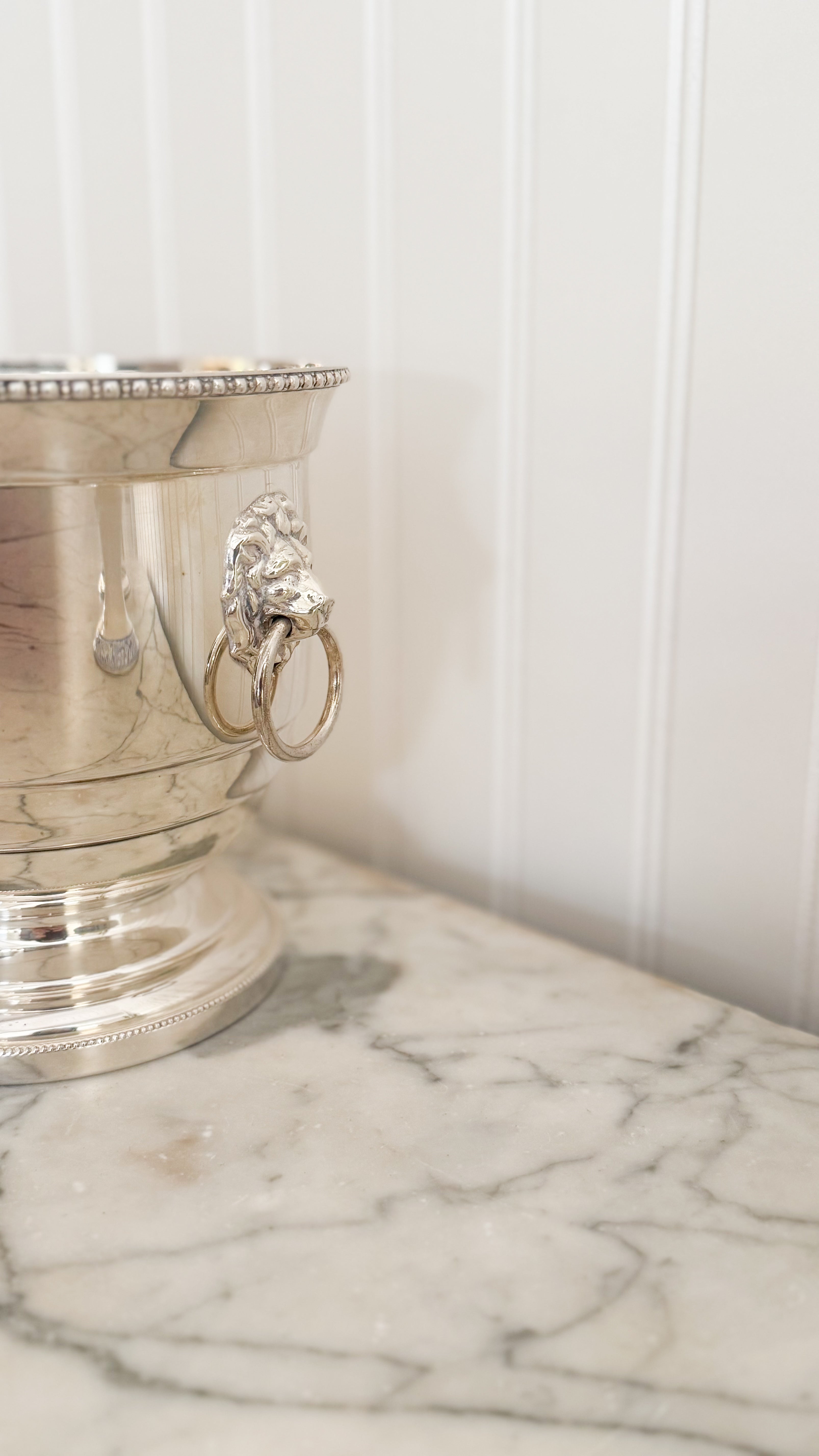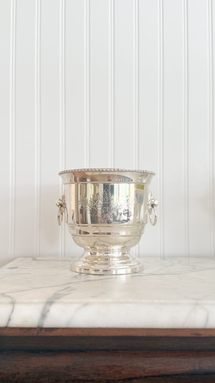 Found in the English countryside, this vintage silver plate ice bucket brings timeless sophistication to any barware collection. It features regal lion head ring handles and a beautifully etched floral motif on one side. The reverse remains plain for a classic, understated look—just as pictured.