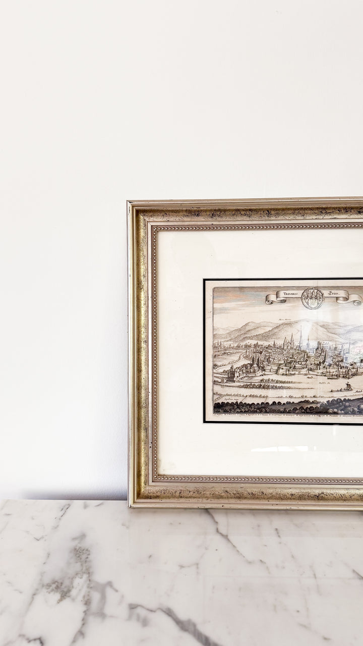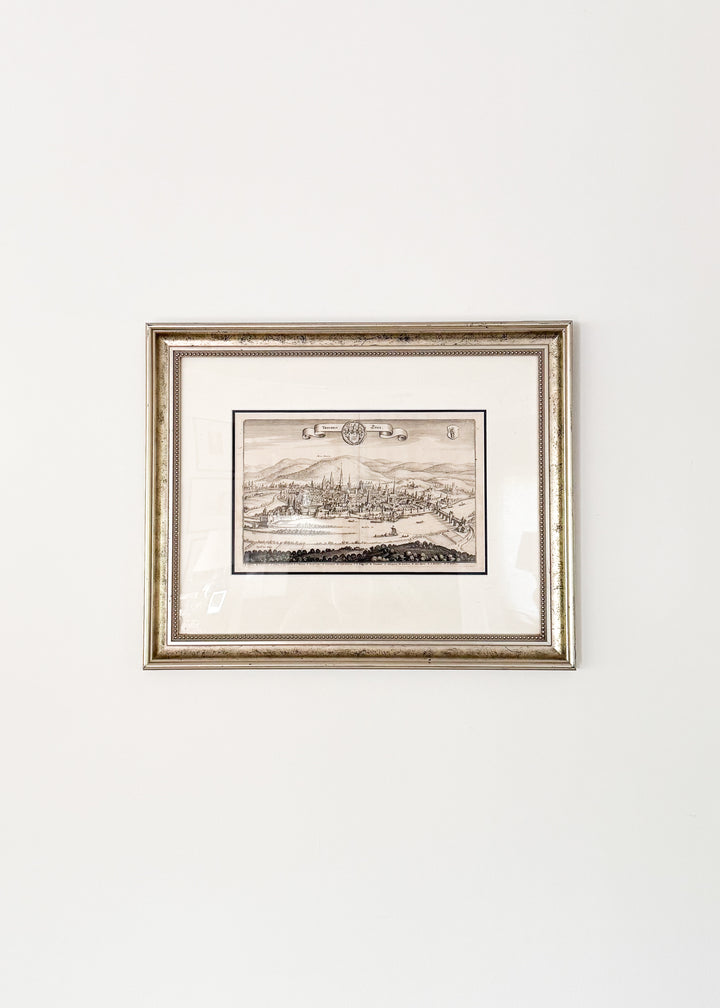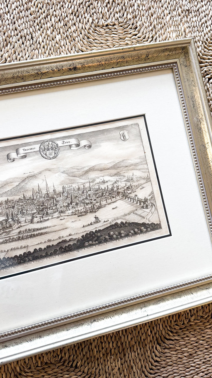Believed to be a 1646 Engraving of the German city of Trier, purchased in Mainz, Germany. Features a generous scale and soft, neutral palate that lends to its transitional nature.
