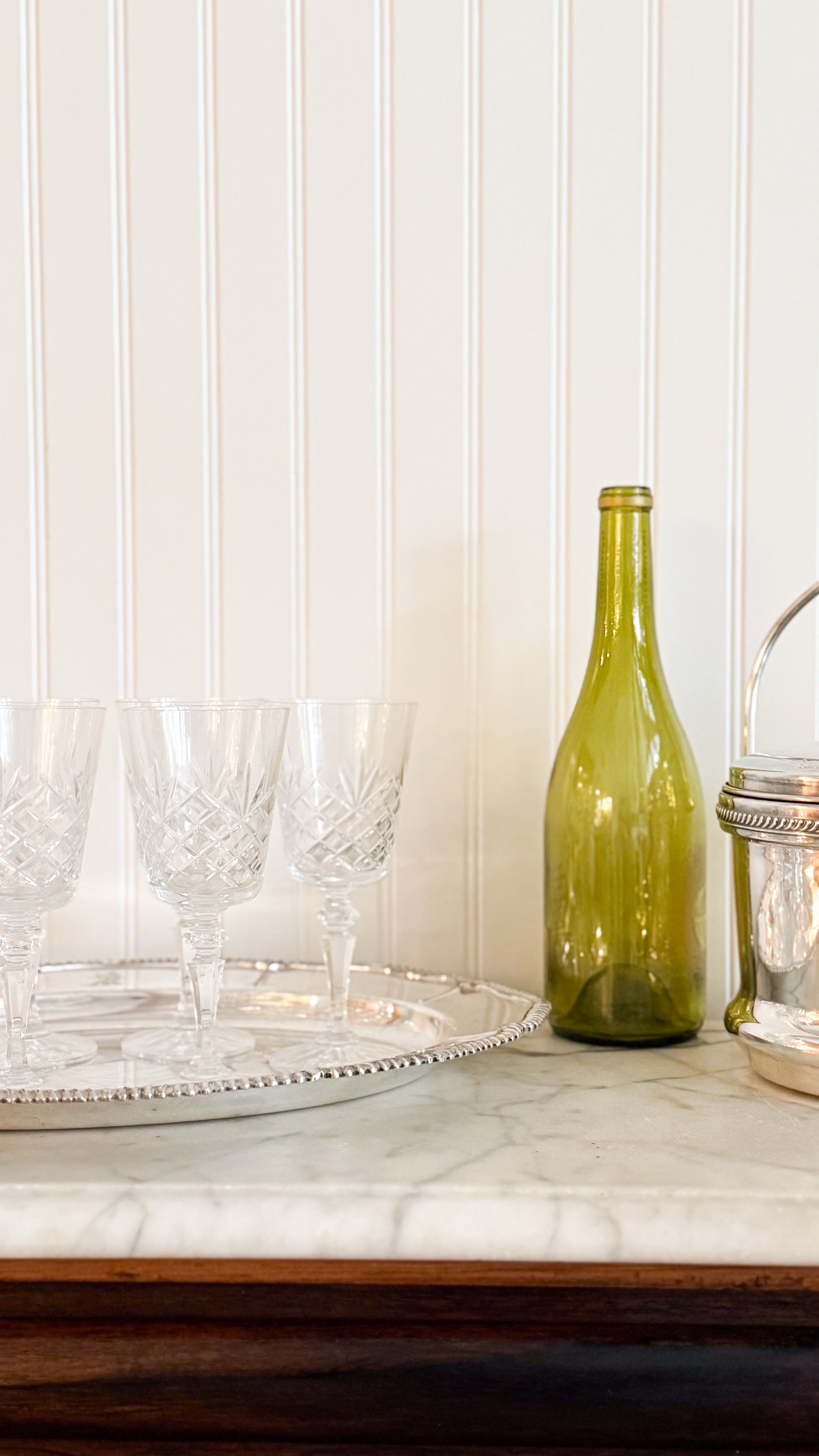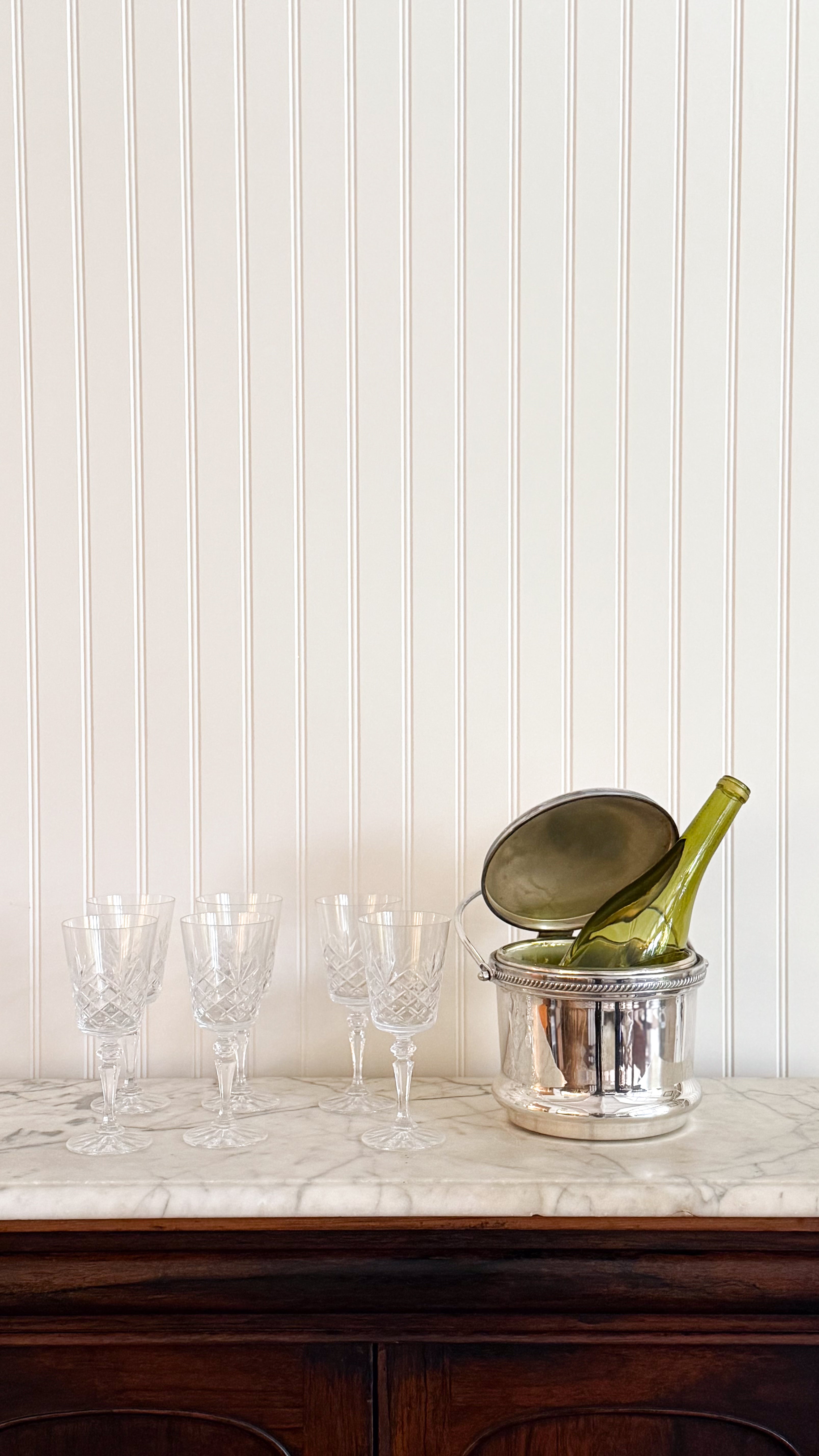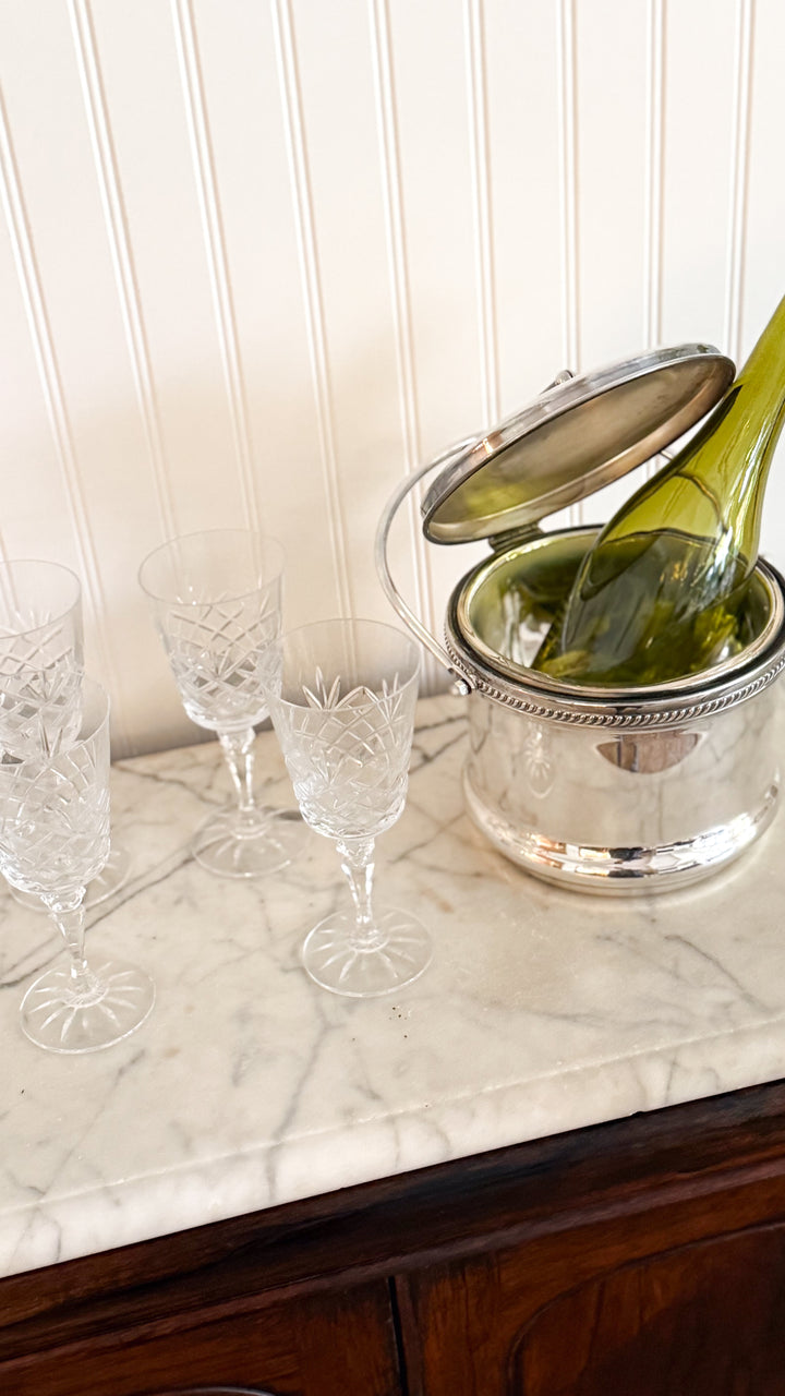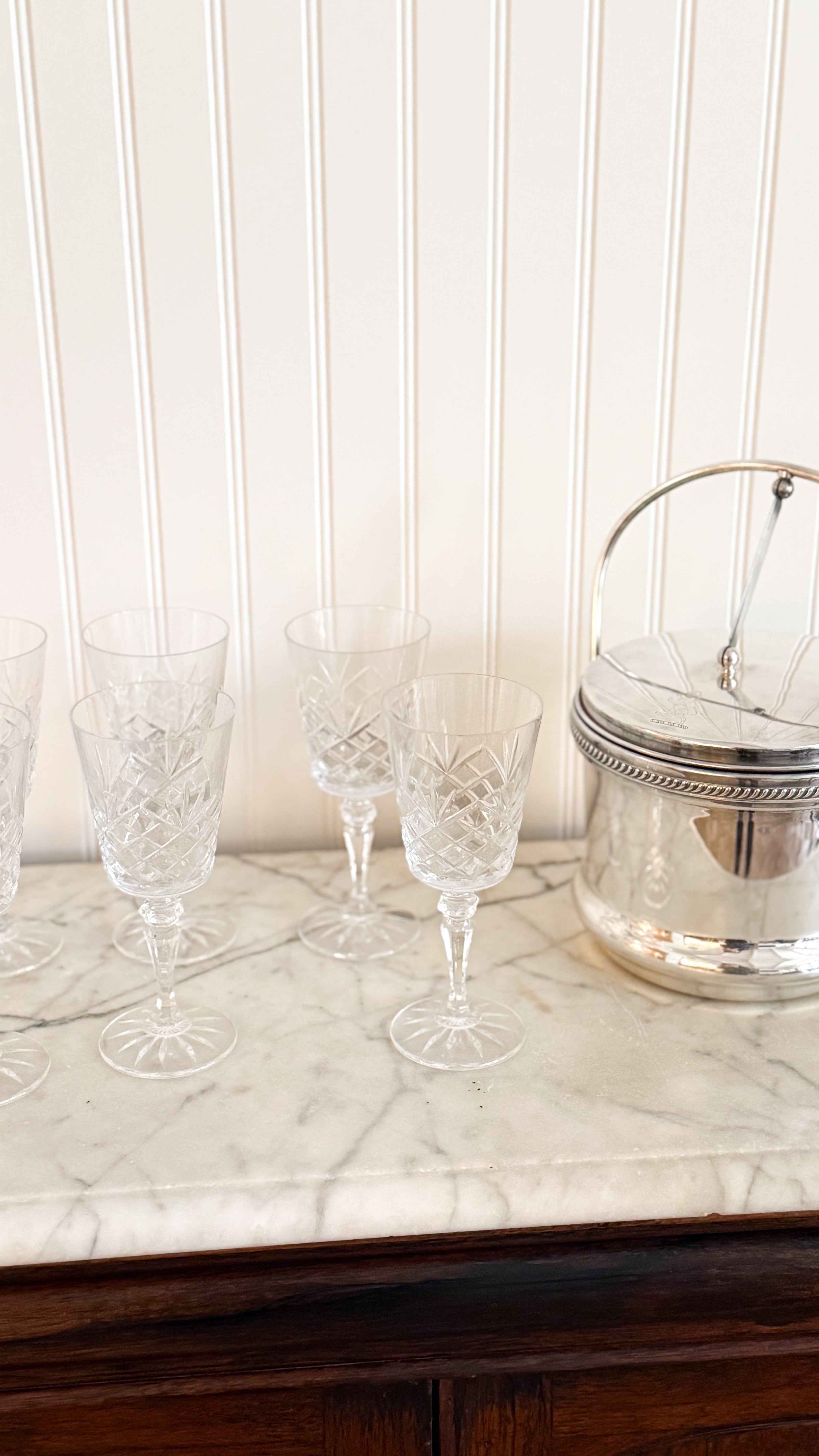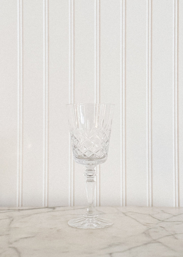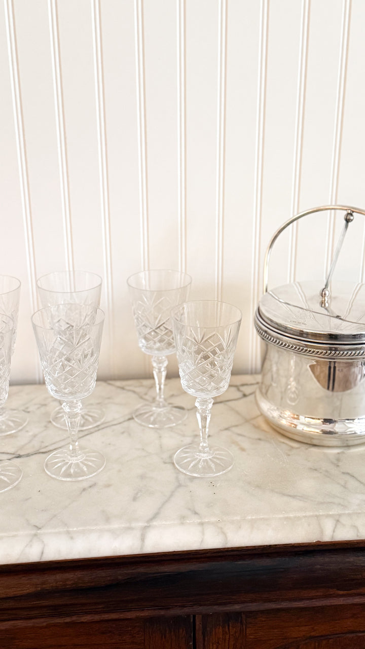 A set of six vintage Irish cut crystal goblets, showcasing a graceful transitional silhouette that bridges classic and modern design. Heavy crystal glassware featuring a precision cut, each glass reflects the artistry and tradition for which Irish crystal is world renowned. Perfectly sized for water, wine, or specialty cocktails. An essential for entertaining.