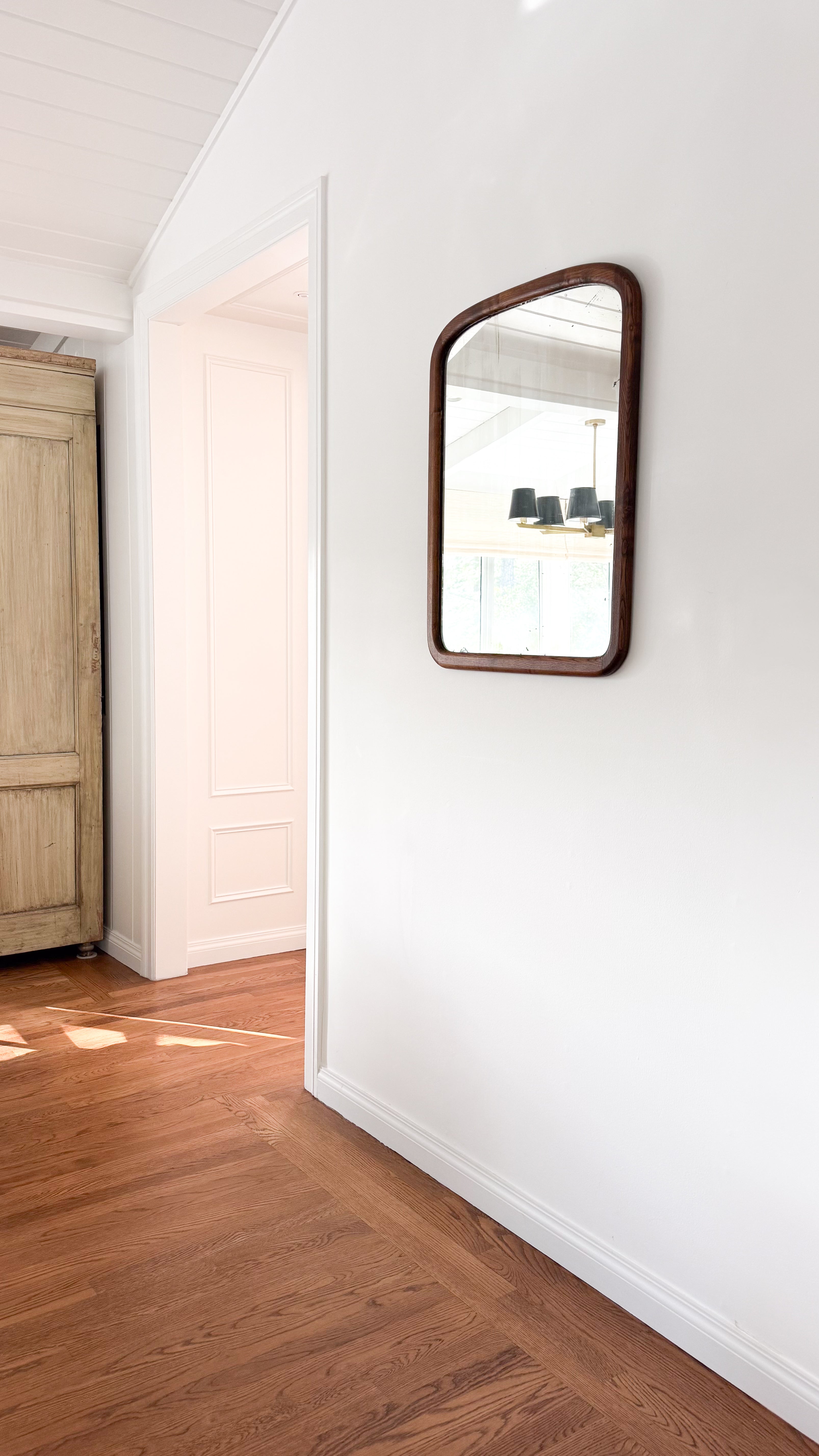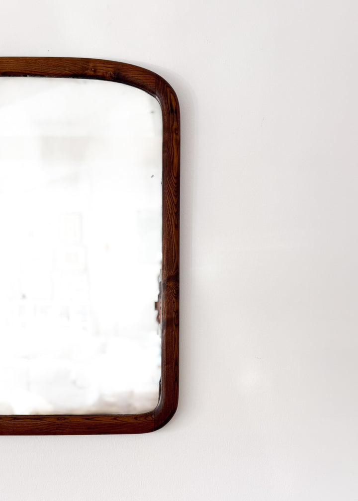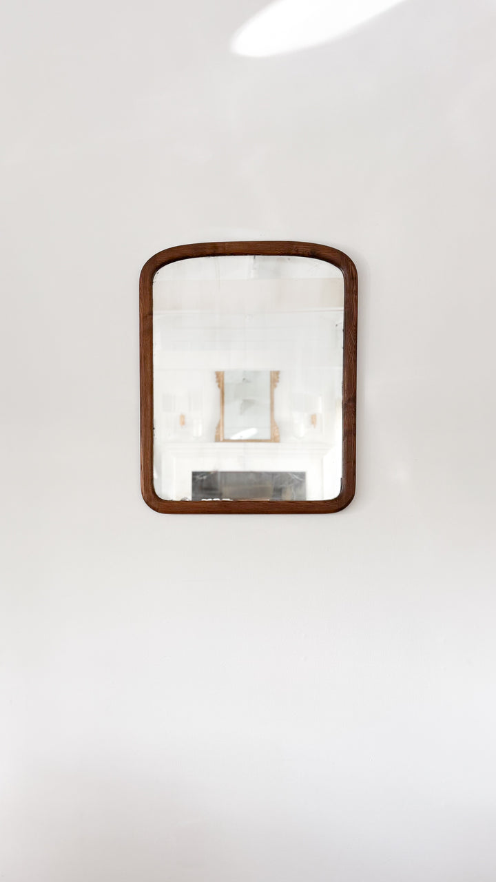 A 19th century American mirror framed in richly grained oak, featuring softly rounded corners and warm, time-deepened tone. Features the original glass. A charming addition to the home.
