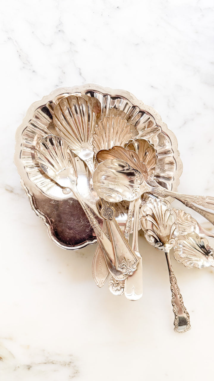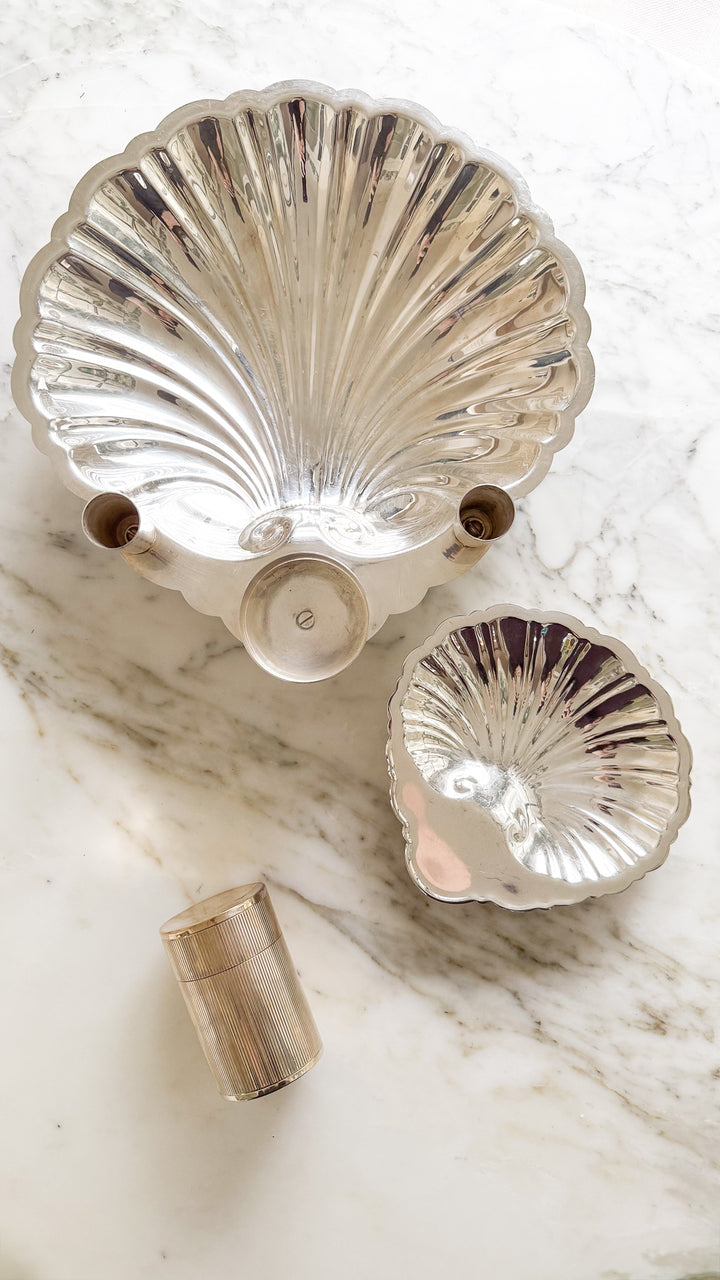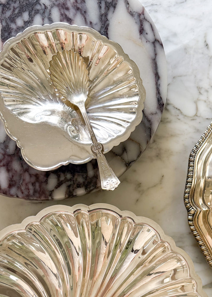 A vintage silver plate footed shell dish—perfect as a catch-all, a styling accent, or a serving piece for entertaining. Elegant and endlessly versatile.
